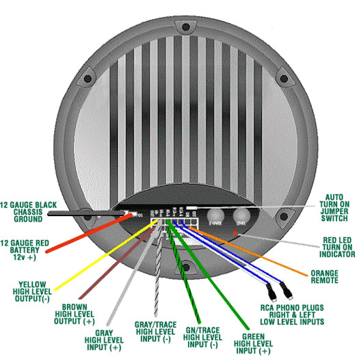 Connect the GREEN wire from the 14-pin Molex plug of the Amplified Bazooka to the source units left (+) positive speaker output. Connect the GREEN W/BLACK stripe wire of the plug to the source units left (-) negative speaker output. Connect the GRAY wire of the plug to the source units right (+) positive speaker output. Connect the GRAY W/BLACK stripe wire of the plug to the source units right (-) negative speaker output. If the source unit has both front and rear speaker outputs, use only one set of speaker outputs for the high-level input of the Amplified Bazooka.