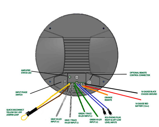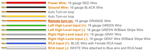 NOTE: If you are not sure of the polarity of the wires that you are tapping into connect one channel first and check it by turning on the unit and listening to it. If there is no output, turn off the unit and reverse the polarity of the inputs wires. If it still has no output, you have other problems, Check all connections. If it sounds correct, turn off the unit and connect the other channel. Turn on the unit again and listen to it, if the output increases, you are connected correctly. If the output drops or is reduced, turn off the unit immediately as it is not the correct polarity and may damage the unit. Reverse polarity of one channel and check it again, the output should increase and the connections should be correct.