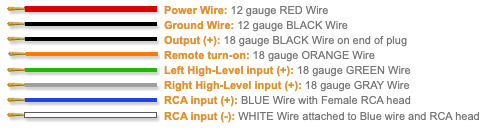 NOTE: If you are not sure of the polarity of the wires that you are tapping into connect one channel first and check it by turning on the unit and listening to it. If there is no output, turn off the unit and reverse the polarity of the inputs wires. If it still has no output, you have other problems, Check all connections. If it sounds correct, turn off the unit and connect the other channel. Turn on the unit again and listen to it, if the output increases, you are connected correctly. If the output drops or is reduced, turn off the unit immediately as it is not the correct polarity and may damage the unit. Reverse polarity of one channel and check it again, the output should increase and the connections should be correct.