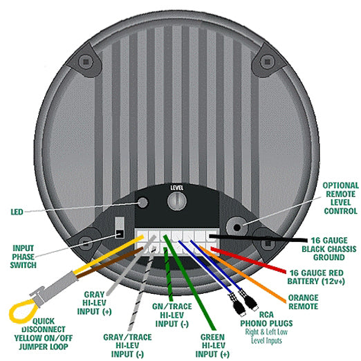 Locate the potentiometer labeled LEVEL. This is the level control. Start with the level control turned all the way to the right (clockwise). The bass should be off or very low at this point. Turn up your head unit until the sound form the existing speakers starts to clip or distort. This is the point in your system where you will get maximum volume with the least amount of distortion. With the head unit at this point, turn the level gain control up slowly until the bass volume blends well with the existing high frequency speakers. This should be the proper setting for the level gain control. Now that the level is set, you may want to go back to the crossover control and adjust the crossover point by ear to meet the desired sonic quality of your system design.
